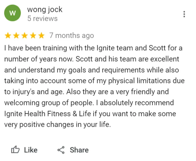 "Initially when I decided to join the online 12-week challenge with Ignite fitness, I thought I knew what to expect as I had been a part of other 12-week challenges at a gym. However, what I quickly realised that Scott’s philosophy is not just focussed on your results, how many times you have trained and what you have eaten, but he also focuses on your mental state too. By having the 1 one 1 weekly coaching sessions to talk about my habits, fears, goals, it has made me sit up and seriously take a look at myself of how I viewed myself and how it affects me in a positive or negative way. When I started the coaching sessions, I was struggling with my own identity issues, however through Scott’s advice and encouragement he was able to refocus my thoughts. When I did this, I was able to make better choices of what I ate and how hard I trained. The advice that I received in these sessions, I have been able to apply not just to my weight loss journey, but in all aspects of life.”