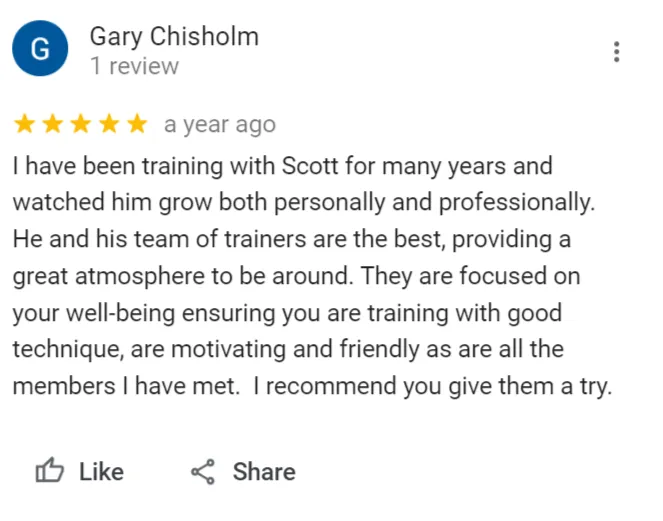 “I am a 47 year old with a wife and 2 kids. I am a very busy owner of a growing business in the building industry. At 38, I began to lose my fitness and had no drive. My partner was complaining that I couldn’t keep up with her. At 40 I developed a bad back… I knew I had to do something… I was heading in a downhill spiral quickly. I met Scott and began training under his personal guidance. He provided specifically designed exercises to improve the physical areas that needed developing. My back muscles have become stronger and I am very glad to boast now that I have not had pain in that area for 5 years. As well as developing my back strength, he has provided all round strength and fitness to my specific needs. Not only has there been a physical improvement, I also have such a positive outlook on life now. My confidence has increased and I have so much more energy to play with the kids now. I have become great friends with Scott and have recommended many others to receive the great benefits he provides. Scott has changed my life journey…”