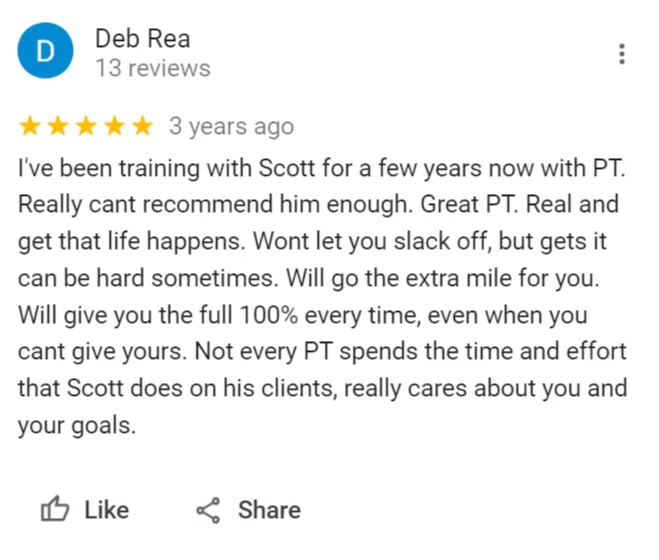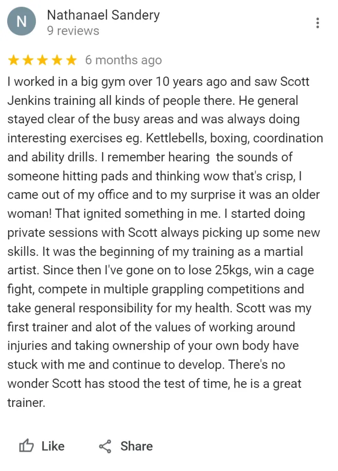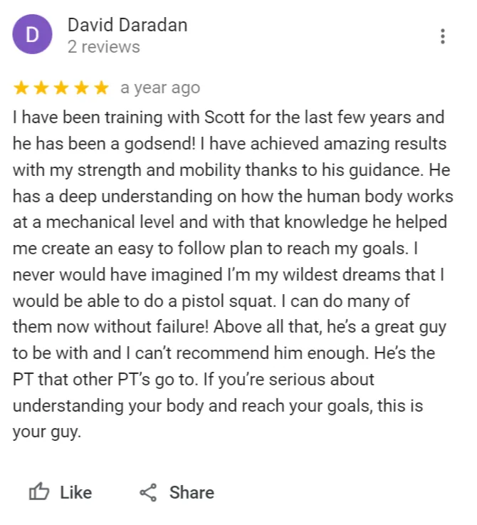 "I first started training with Scott about 4 years ago. My motivation was maybe a bit different to most in that as a new trainer myself I wanted to understand what it was like from a client's perspective. I also understood that while I "knew how to train myself", I would never be able to challenge myself as much as he could. I also find that being able to troubleshoot exercise technique and training strategies is invaluable. What made me choose Scott was his experience, his balanced philosophy and his no excuses in the pursuit of progress mentality. Originally I thought Scott was super serious and while he does have a serious side he's very easy to talk to and joke around with as well. It's just how much he cares about getting results for his clients. He has helped me overcome back and shoulder pain at different times and I have built strength throughout my whole body that makes me feel almost invincible to injury. The biggest doubt I had before I started was whether I would see a return on the investment of training. I was only just starting my business so money wasn't abundant but I have found that the skills, strength and mindset I have picked up along the way have been priceless. I would not be half the trainer or the man that I am without his guidance.