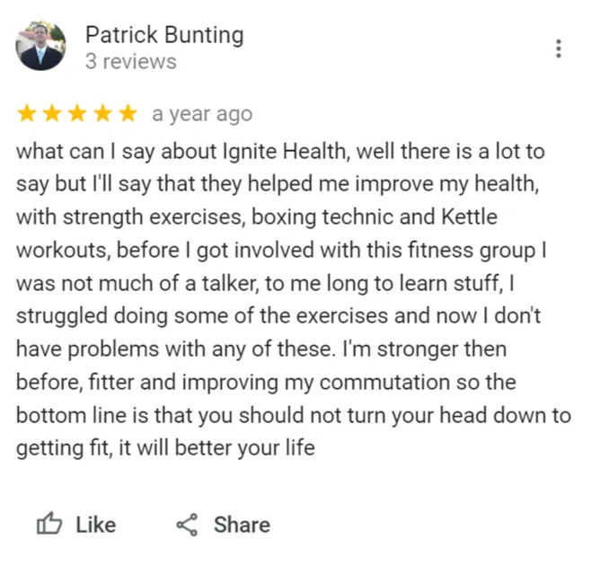 "Training with Ignite has been a journey about improving, not just my fitness, but my quality of life. Scott's approach of quality in movement and strong technique has significantly improved my day to day life and given me the tools to continue to build and improve my physical and mental well-being. Making a commitment to training with Ignite has reduced my exercise low times, and made it easier to have longer and better exercise highs. I have used Ignite as my staple exercise diet for over a decade. With this twice weekly routine have been able to keep my weight at an appropriate level, my injuries to a minimum and found my previous back pains no longer exist. With Scott and Antoni I have found a fantastic balance of strength training, flexibility, alternative movement and cardio fitness that has me always looking forward to my sessions. Every session is slightly different, and they are not afraid to try new things with our group, which keeps things interesting. The sessions are appropriately challenging without being so onerous or painful that I do not want to go back. Being part of a group means I am motivated to be there and I push myself a little harder than when I might exercise alone. Fitness sessions with Scott and Antoni have become an important part of keeping my quality of life high.